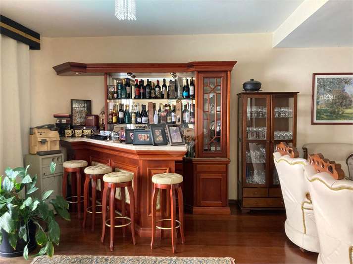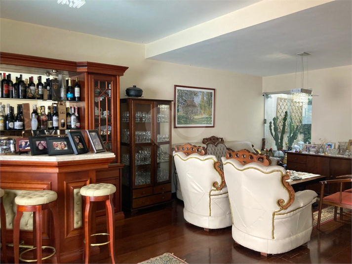 Ampla sala para três ambientes com piso de madeira, lavabo e jardim de inverno.